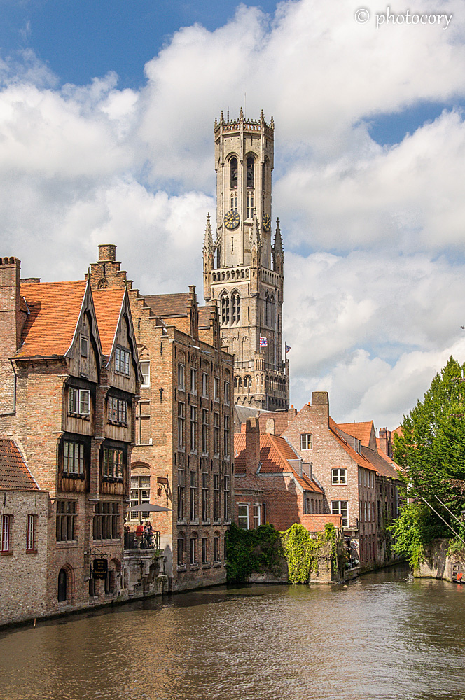 The Belfry tower, view from Rozenhoedkaai, the most photographed spot in Bruges