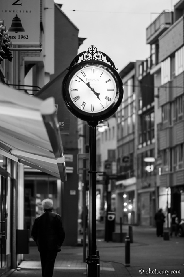 A shopping street in Hasselt. The clock shows the correct time: almost 5 in the evening